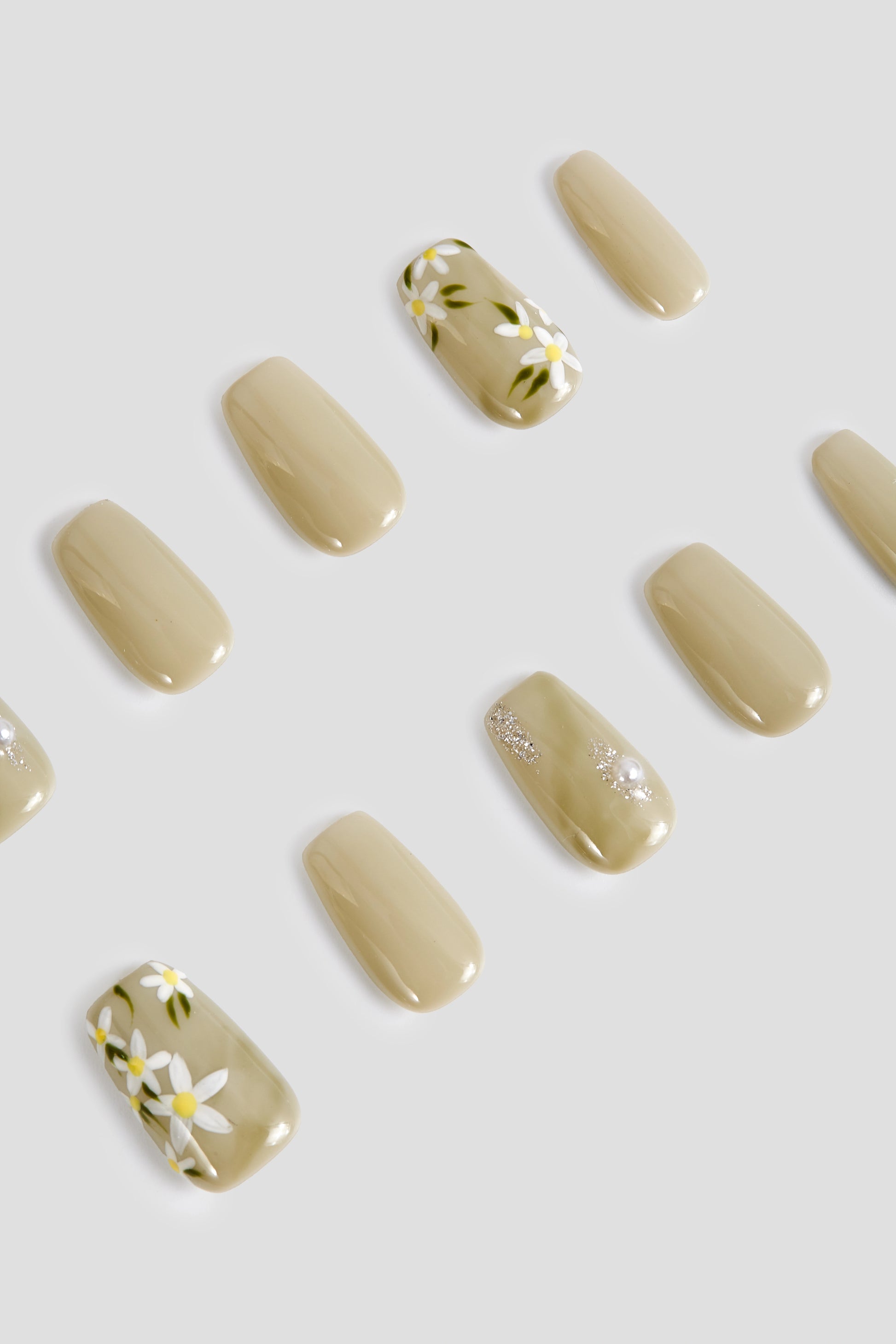 These nails feature delicate white flowers on a vibrant green base, ideal for pairing with your favorite green outfit.