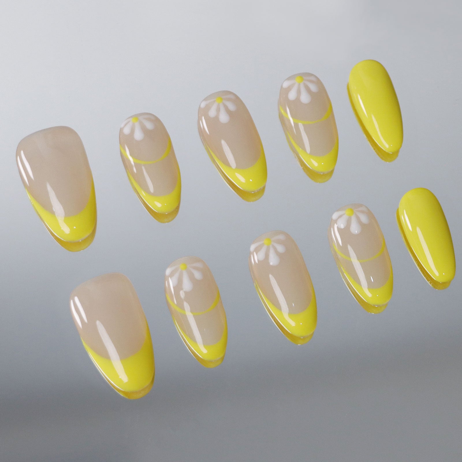 Brighten your summer style with these cheerful yellow press-on nails adorned with delicate white flower designs!