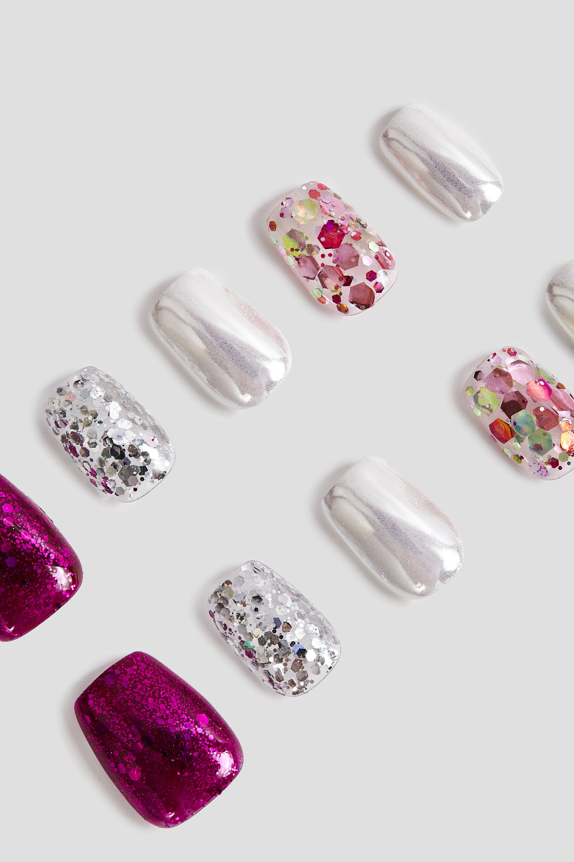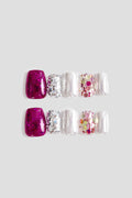 These pink glittery nails create a stunning, eye-catching effect that will keep you shining all night long. Perfect for any special occasion, these nails are easy to apply and give you a bold, glamorous look without the hassle of traditional nail polish. Experience party perfection with Party Till The Morning (PINK).