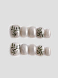 These nails feature a unique silver bamboo design, bringing a touch of quirkiness to any outfit.